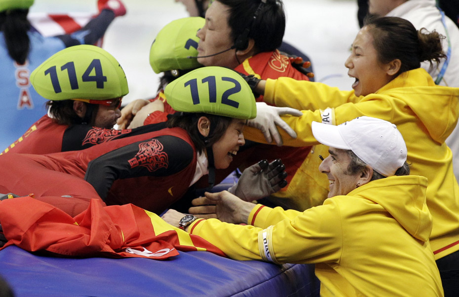 當(dāng)?shù)貢r間2月24日,溫哥華冬奧會女子短道速滑3000米接力A組決賽中,中國隊王濛、周洋、孫琳琳、張會四朵金花聯(lián)袂出擊,最終將金牌歸入中國隊囊中。圖片來源:中國新聞網(wǎng)