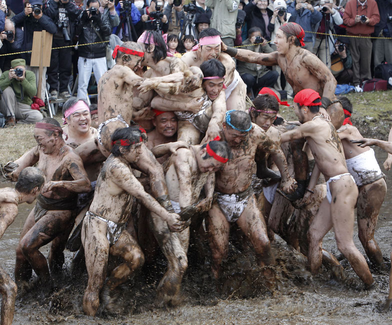 2月25日,在日本千葉縣四街道市郊外的稻田里,居民們參加一年一度的“泥漿節(jié)”。當(dāng)?shù)氐哪凶觽兂嗌硖M(jìn)稻田,把泥漿涂抹在身上。人們希望通過這種儀式祈求新的一年能有個(gè)好收成。