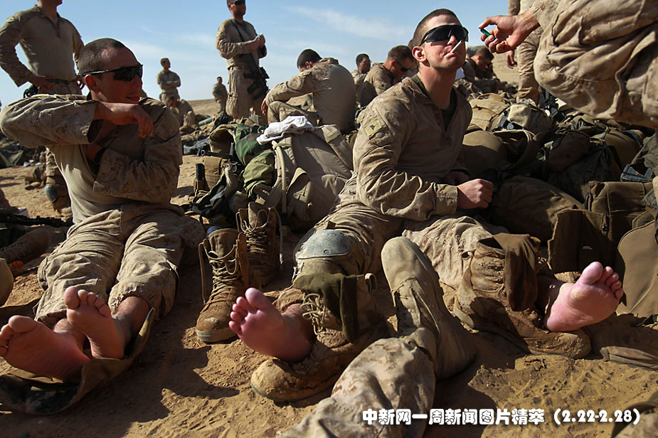 23日(周二),在阿富汗馬爾賈城,美軍陸戰(zhàn)隊士兵們在行動結(jié)束后坐下來休息。