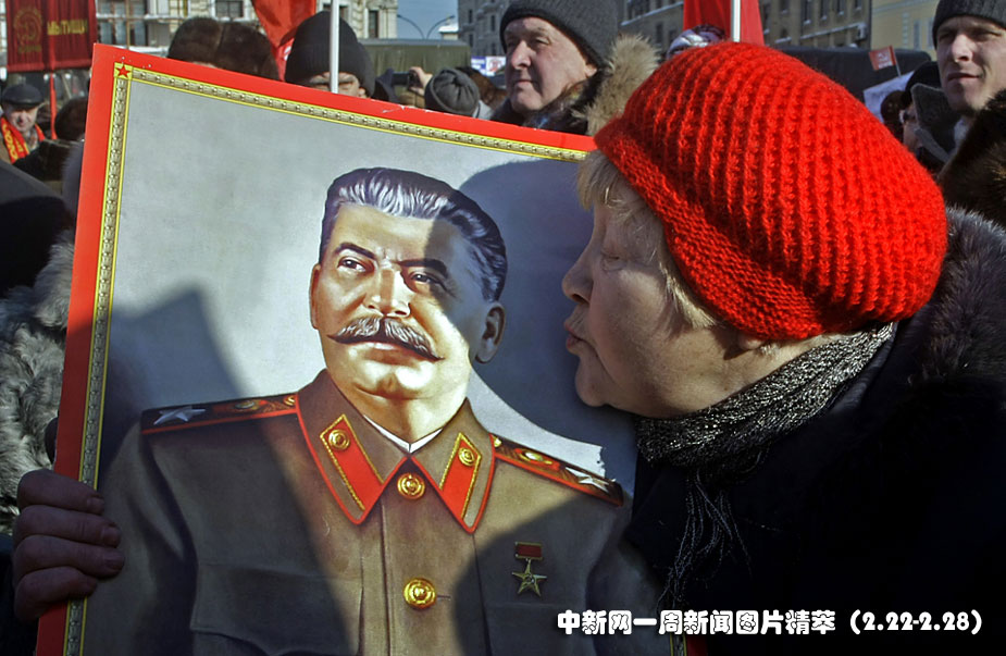 23日(周二)為慶祝俄羅斯祖國保衛(wèi)者日,共產(chǎn)黨員在莫斯科進行了大游行。一位女士在游行中親吻斯大林的畫像。