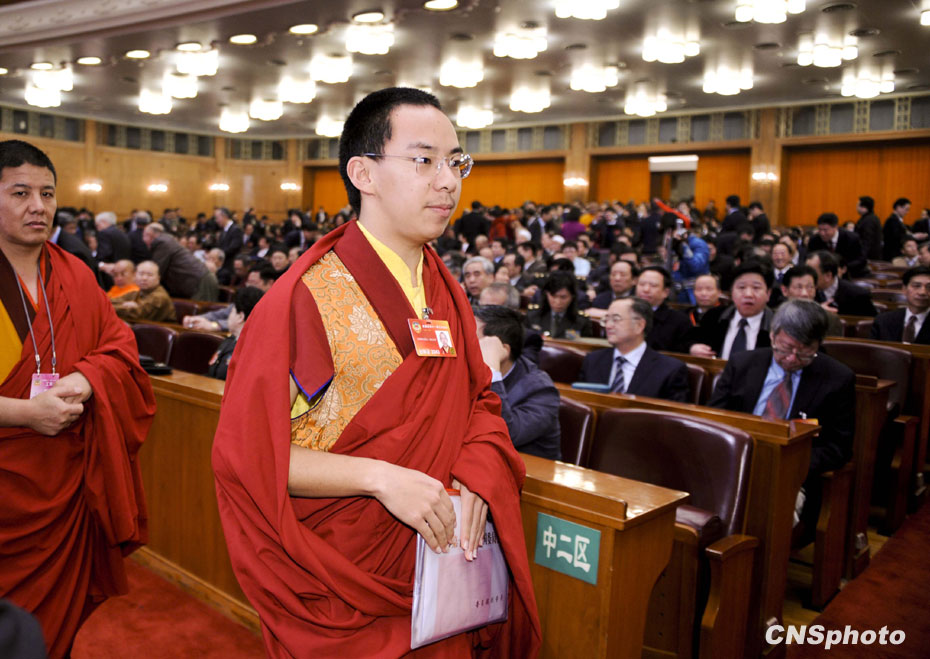 3月3日下午,全國政協(xié)十一屆三次會議在北京人民大會堂開幕,十一世班禪額爾德尼·確吉杰布出席會議。中新社發(fā) 廖攀 攝