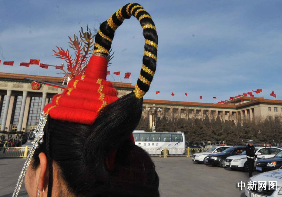 十一屆全國(guó)人大三次會(huì)議3月5日在北京開(kāi)幕,各民族人大女代表的服飾靚麗多彩,在天安門廣場(chǎng)前大展英姿。 中新社記者 賈國(guó)榮 攝