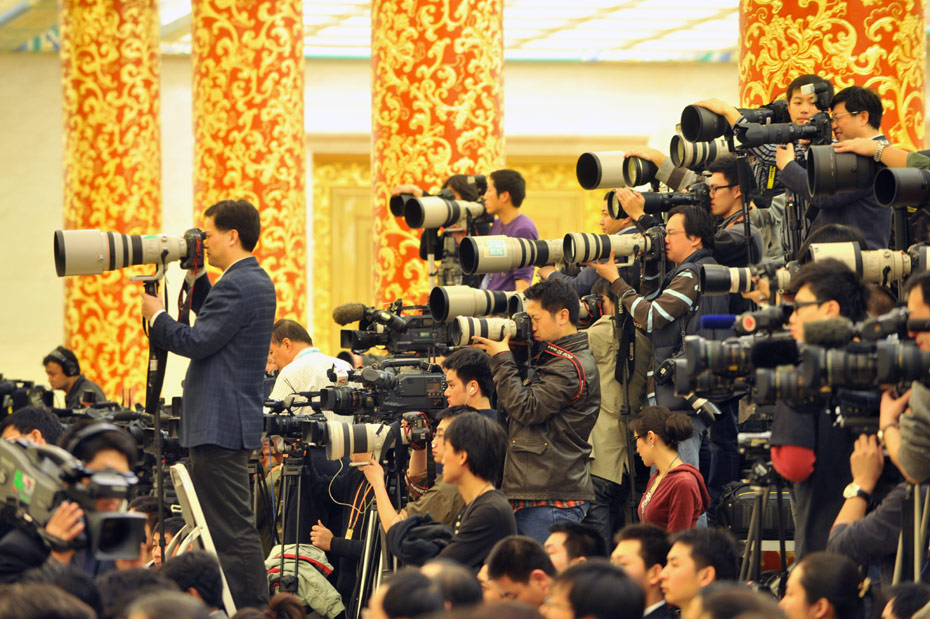3月14日上午,國(guó)務(wù)院總理溫家寶在人民大會(huì)堂三樓金色大廳與采訪十一屆全國(guó)人大三次會(huì)議的中外記者見(jiàn)面并回答記者提出的問(wèn)題。圖為現(xiàn)場(chǎng)記者。中新社記者 賈國(guó)榮 攝。圖片來(lái)源:中國(guó)新聞網(wǎng)