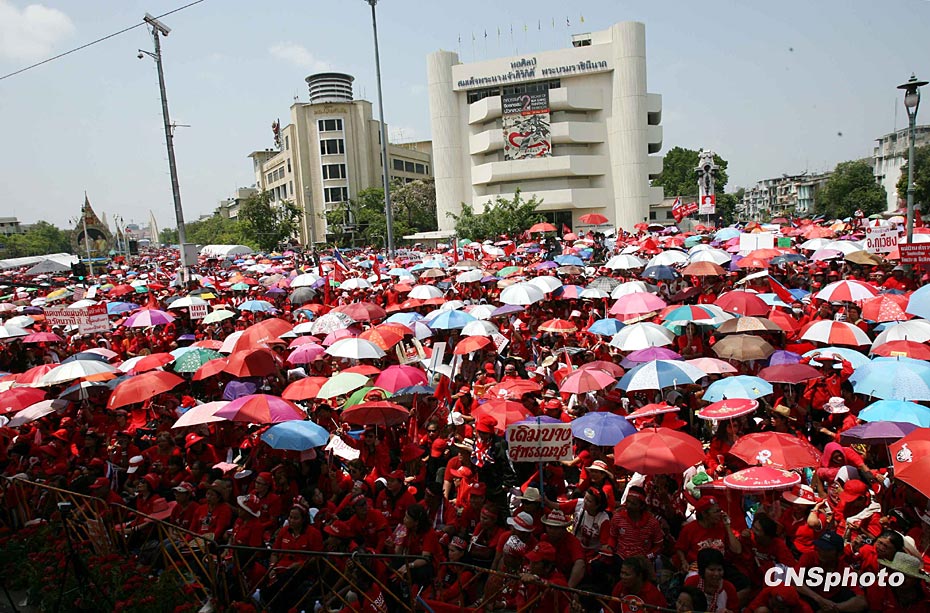 3月13日起,泰國(guó)“紅衫軍”陸續(xù)從泰國(guó)北部、東北部等外府進(jìn)入曼谷市,在集會(huì)主會(huì)場(chǎng)搭設(shè)演講舞臺(tái)和帳篷,拉開(kāi)大規(guī)模示威序幕。圖片來(lái)源:中國(guó)新聞網(wǎng)