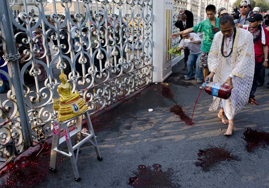泰國反政府組織“紅衫軍”成員將血液潑灑在曼谷總理府門前,以此向政府施壓要求解散國會(huì)下議院。圖片來源:中國新聞網(wǎng)