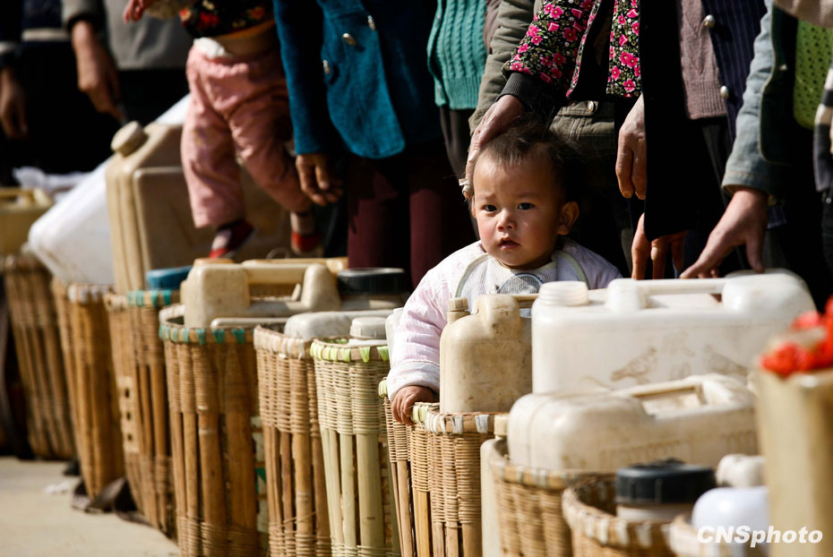 3月12日,云南省富源縣小羊場村,1名兒童隨母親來到村口排隊取水。中新社發(fā) 保旭 攝