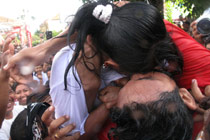 如果不說話,她能滿足所有男人對女人最原始的憧憬——巴掌大的小瓜子臉上,濃密的齊劉海和流利的黑眼線共同強調出一對碩大的眼睛,眼珠在小扇子一樣撲閃撲閃的睫毛下面望著你,無辜得像一個剛從造物主手中問世的SD娃娃。這不是全部,還有更震撼的信息等著再給你的心一記重擂——在精致妝容下根本看不出實際年齡的臉,加上65E的胸圍,再配上一尺六寸的小腰,哪怕同是女人,光想一想這不切實際的場景也足以胸悶到內傷。