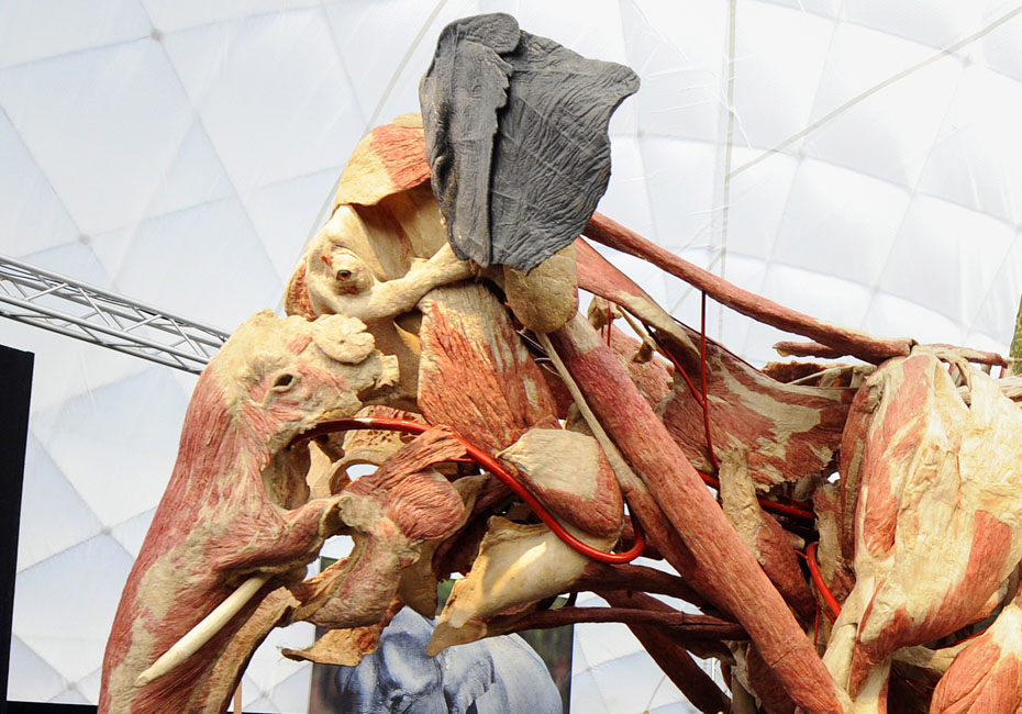 德國著名解剖學(xué)家鞏特爾·馮·哈根斯博士被稱為“死亡先生”,目前展出的是有史以來的最大的動(dòng)物尸體。體型巨大的“桑芭”尸體高3.5米,重3.2噸。據(jù)悉“桑芭”將于2010年4月歸還諾因基興動(dòng)物園。圖片來源:中國新聞網(wǎng)