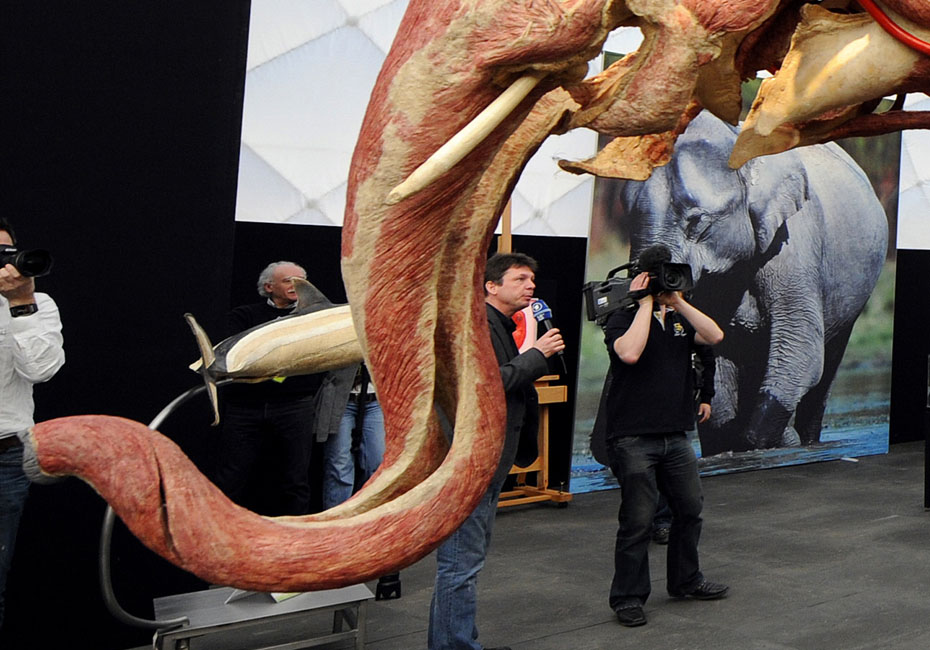 德國(guó)著名解剖學(xué)家鞏特爾·馮·哈根斯博士被稱為“死亡先生”,目前展出的是有史以來的最大的動(dòng)物尸體。體型巨大的“桑芭”尸體高3.5米,重3.2噸。據(jù)悉“桑芭”將于2010年4月歸還諾因基興動(dòng)物園。圖片來源:中國(guó)新聞網(wǎng)