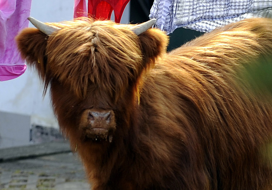 3月18日,德國一頭蘇格蘭高地牛來到一居民院內(nèi)懶洋洋的曬太陽,最后經(jīng)過獸醫(yī)的麻醉和消防員協(xié)力才將這頭蠻力十足的家伙“制服”。圖片來源:中國新聞網(wǎng)