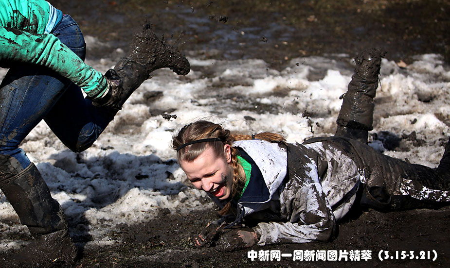 17日(周三), 在美國北達科他州舉行的一場女子泥潭摔跤比賽中,勝利的一方露出笑容。