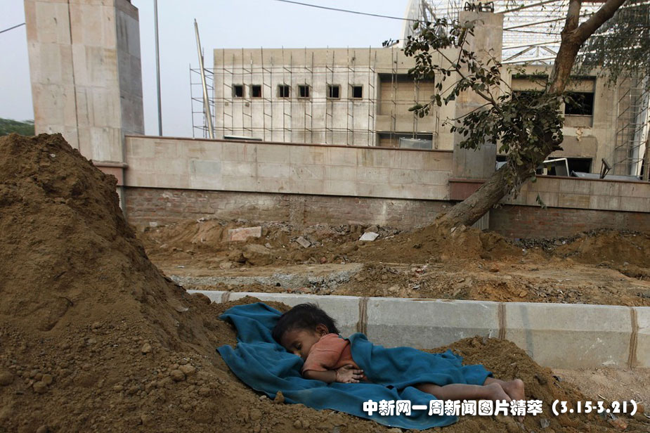 18日(周四),印度新德里,一個(gè)孩子在英聯(lián)邦運(yùn)動(dòng)會(huì)體育場(chǎng)外的工地上睡覺(jué)。