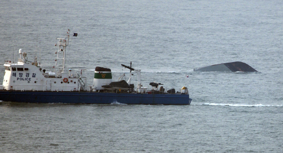 首爾當(dāng)?shù)貢r(shí)間26日晚9點(diǎn)45分許,在韓國(guó)西部海域執(zhí)行警戒任務(wù)的天安艦(1200噸級(jí))因不明原因事故,船底被炸開(kāi)洞,船尾開(kāi)始下沉。天安艦上共有104人,韓國(guó)巡邏艇和直升飛機(jī)迅速展開(kāi)救援行動(dòng),事發(fā)5小時(shí)后,官員稱(chēng)已救出58人,但因?yàn)閺?qiáng)風(fēng)和夜幕,救援行動(dòng)進(jìn)展緩慢,其它人員仍下落不明。圖為一艘救援船靠近幾近沉沒(méi)的韓國(guó)海軍“天安艦”。