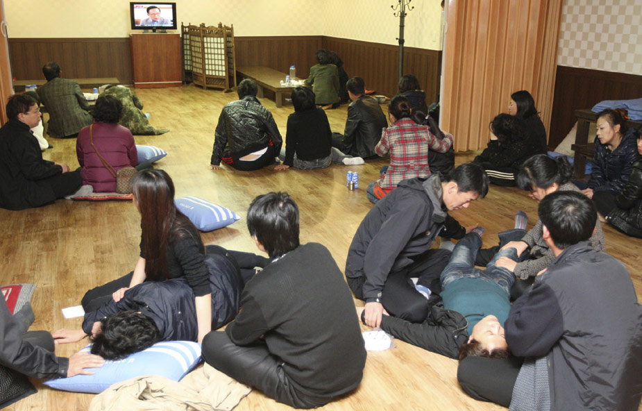首爾當?shù)貢r間26日晚9點45分許,在韓國西部海域執(zhí)行警戒任務(wù)的天安艦(1200噸級)因不明原因事故,船底被炸開洞,船尾開始下沉。天安艦上共有104人,韓國巡邏艇和直升飛機迅速展開救援行動,事發(fā)5小時后,官員稱已救出58人,但因為強風和夜幕,救援行動進展緩慢,其它人員仍下落不明。圖為韓國海軍“天安艦”上士兵的家屬正圍在電視前等待消息。