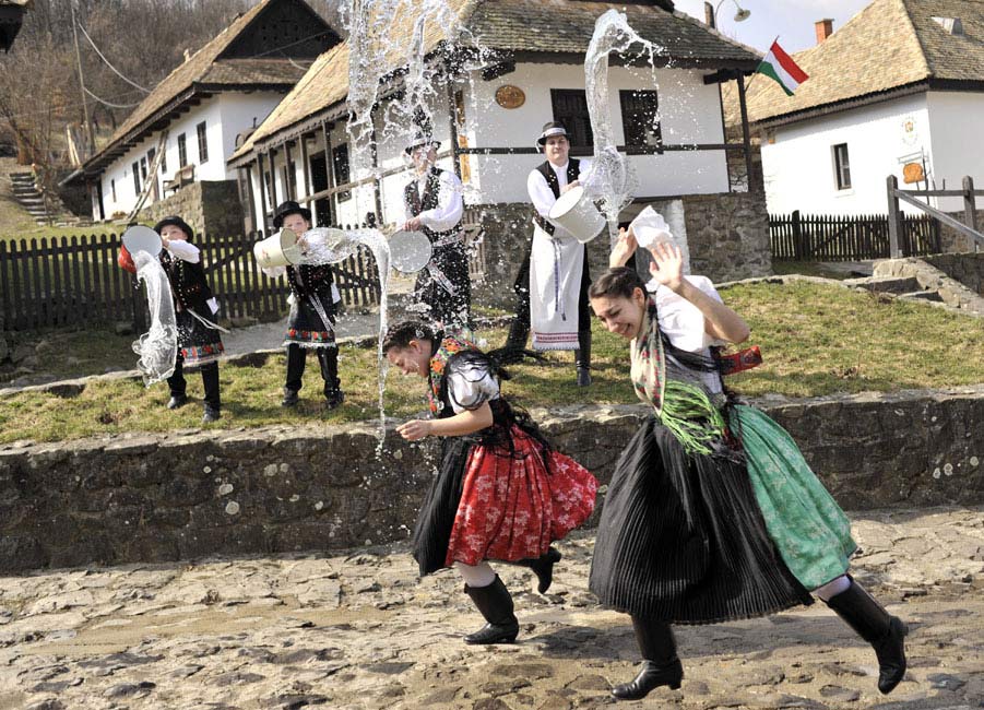 3月26日,在匈牙利首都布達(dá)佩斯以東被譽(yù)為世界文化遺產(chǎn)的霍洛克村,當(dāng)?shù)鼐用褚韵蚬媚锷砩蠞娝膫鹘y(tǒng)儀式慶祝復(fù)活節(jié)。此項古老習(xí)俗起源于公元2世紀(jì)。
