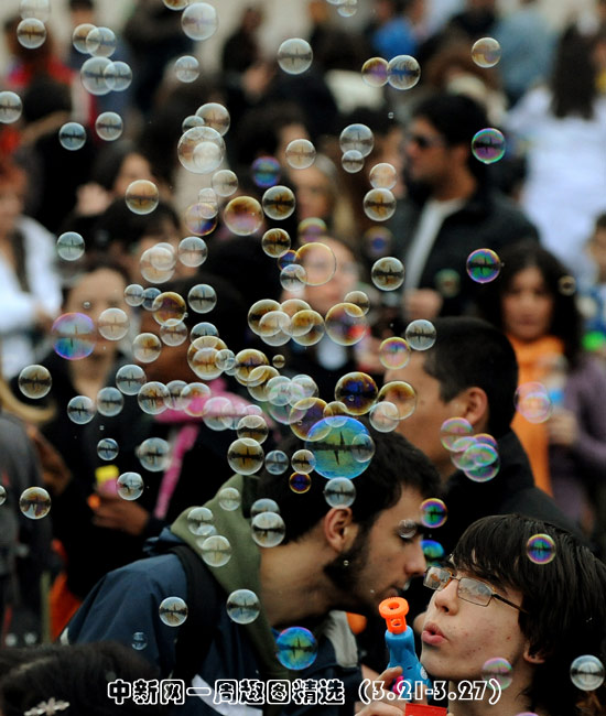 3月21日,在意大利羅馬城中的波波洛廣場,參加“快閃”族聚會的人們吹泡泡迎接春天的到來。圖片來源:中國新聞網>>點擊觀看詳細內容
