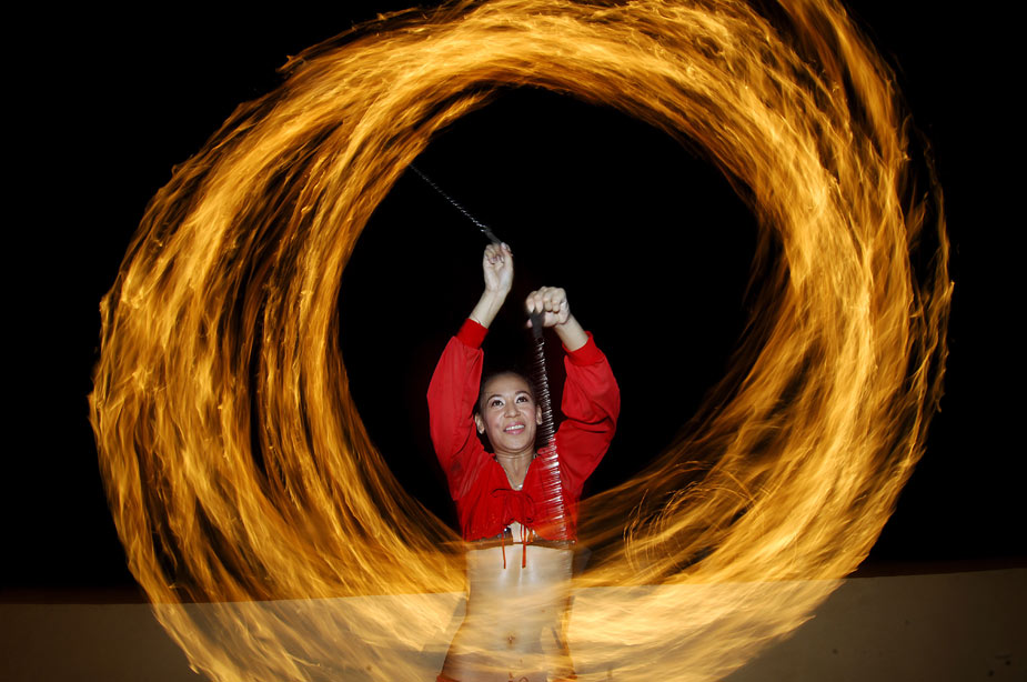 當?shù)貢r間3月25日,在菲律賓馬尼拉,一名舞者在火焰中“熱舞”。