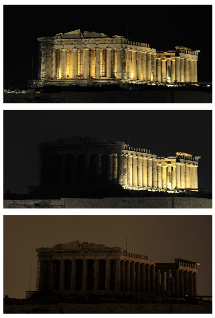 由世界自然基金會(huì)發(fā)起的“地球一小時(shí)”環(huán);顒(dòng)27日20點(diǎn)30分按照時(shí)區(qū)依次在全球數(shù)千個(gè)城市展開(kāi)。圖為希臘帕特農(nóng)神廟在熄燈前和熄燈后的景色。