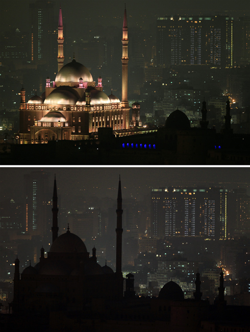 由世界自然基金會(huì)發(fā)起的“地球一小時(shí)”環(huán);顒(dòng)27日20點(diǎn)30分按照時(shí)區(qū)依次在全球數(shù)千個(gè)城市展開。圖為埃及伊斯蘭教清真寺在熄燈前和熄燈后的景色。
