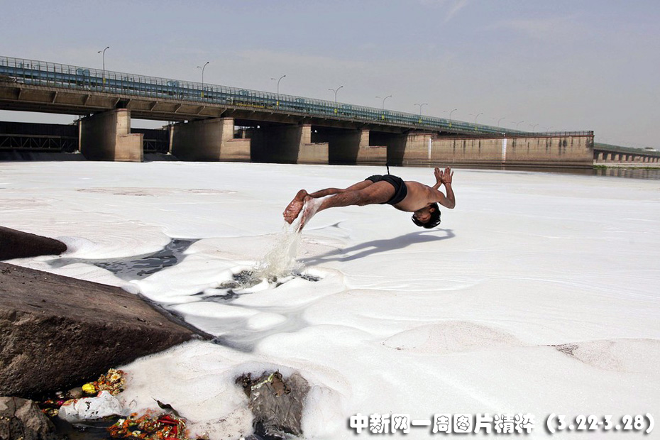 3月22日,新德里一名男子跳進(jìn)遭到污染的亞穆納河。有關(guān)官員稱,工廠無(wú)視法規(guī)傾倒未經(jīng)處理的污水和工業(yè)廢水,使有毒物質(zhì)流入河水中。