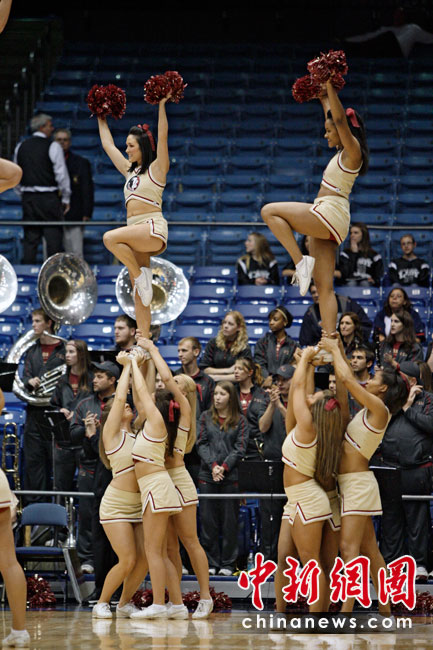 啦啦隊的歷史可追溯到原始部落時期,戰(zhàn)士們狩獵凱旋歸來時,人們給予歡呼及鼓勵的動作。最初的拉拉隊要追溯到19世紀(jì)80年代的美國大學(xué)校園,當(dāng)時的形式是在大學(xué)里的橄欖球賽上,一位領(lǐng)隊站在一大群人前面領(lǐng)導(dǎo)他們?yōu)樽约旱那蜿爡群爸。圖片來源:中國新聞網(wǎng)