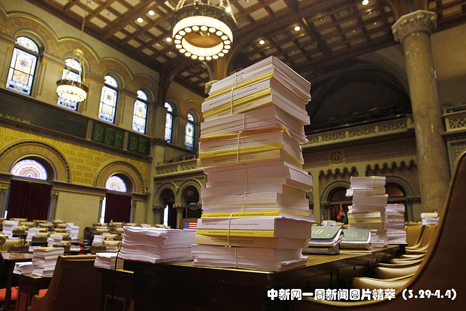 周一(29日),預(yù)算法案堆積在紐約州立委辦公室的桌子上。
