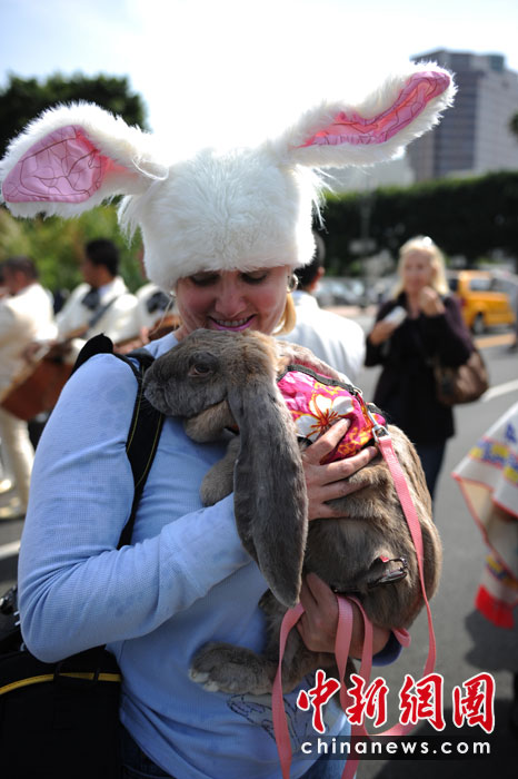 當(dāng)?shù)貢r間4月4日,美國洛杉磯人們在歡慶復(fù)活節(jié)的同時,也為他們的寵物舉行了祝福儀式。這項祝福儀式每年舉行一次。圖片來源:中國新聞網(wǎng)