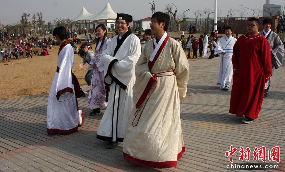 4日,通過網(wǎng)絡結(jié)交崇尚漢文化的青年網(wǎng)友相約在棗莊東湖公園,一起切磋漢文化。當日,通過網(wǎng)絡結(jié)交崇尚漢文化的14名青年網(wǎng)友,利用清明小長假相約在山東省棗莊東湖公園,身著漢服踏青交友,感受漢文化。中新社發(fā) 吉 喆 攝