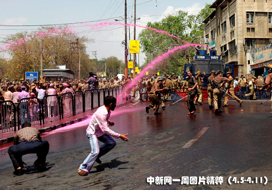 4月5日周一,尋求更多權(quán)利的難民在印度查謨街頭舉行抗議,印度警察動(dòng)用高壓水槍驅(qū)散人權(quán),這些水槍噴出的是粉色水柱。