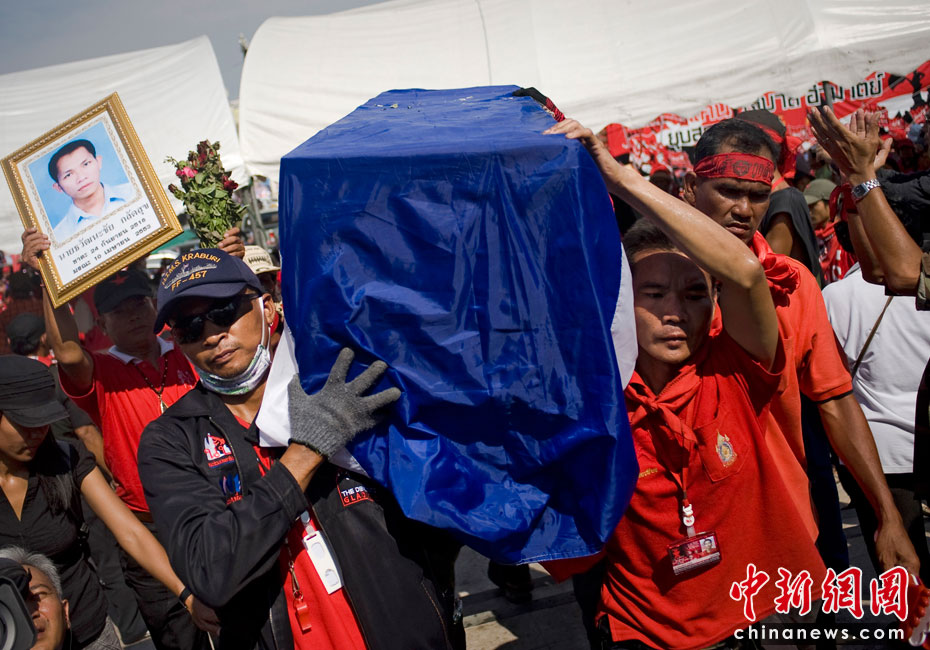 當(dāng)?shù)貢r(shí)間4月12日,泰國紅衫軍在曼谷市區(qū)抬著棺材舉行游行,借此向政府施壓促阿披實(shí)下臺(tái)。此前紅衫軍示威者與軍警發(fā)生沖突,造成21人死亡。圖片來源:中國新聞網(wǎng)
