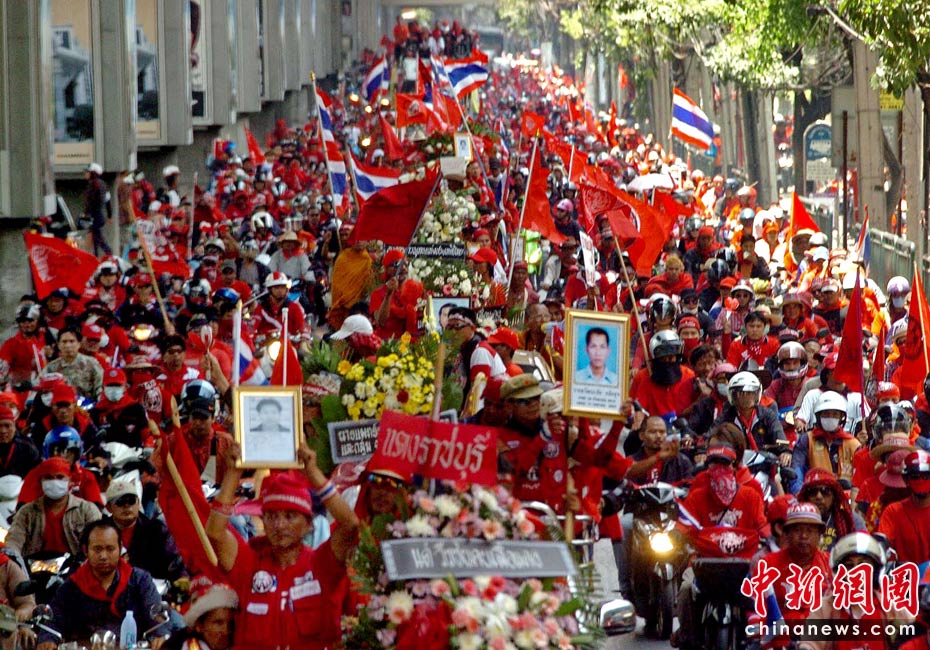 當(dāng)?shù)貢r(shí)間4月12日,泰國(guó)紅衫軍在曼谷市區(qū)抬著棺材舉行游行,借此向政府施壓促阿披實(shí)下臺(tái)。此前紅衫軍示威者與軍警發(fā)生沖突,造成21人死亡。圖片來(lái)源:中國(guó)新聞網(wǎng)