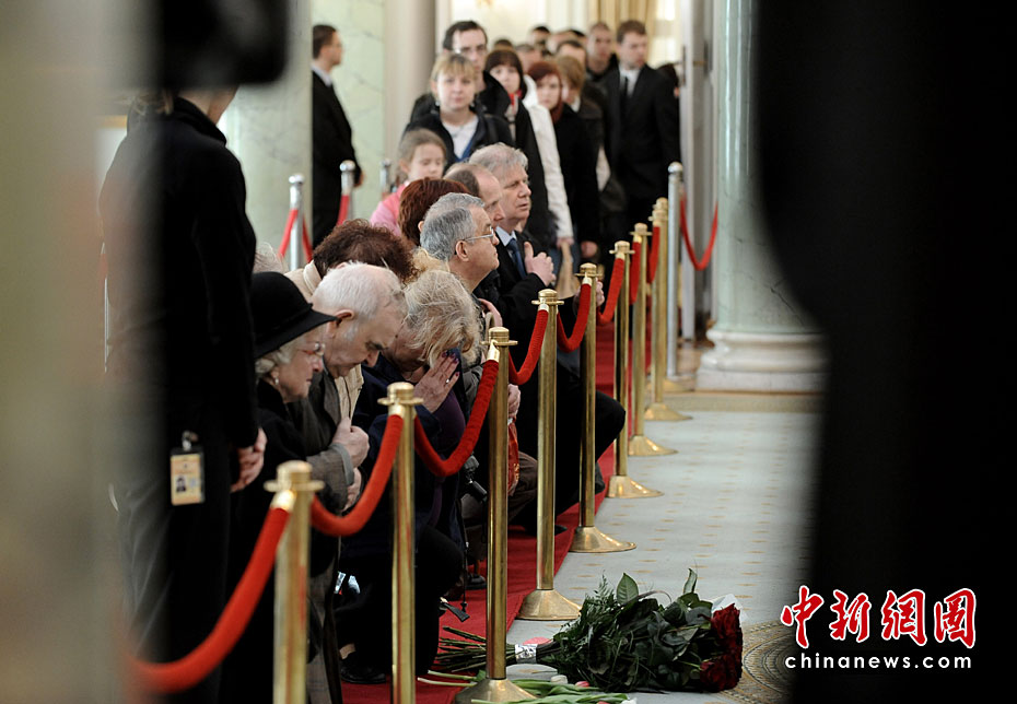 當(dāng)?shù)貢r(shí)間4月13日14時(shí),波蘭總統(tǒng)夫婦的遺體被安放在總統(tǒng)府最大的圓柱廳供民眾瞻仰和悼念?偨y(tǒng)卡欽斯基及其夫人的葬禮將于18日舉行。圖片來(lái)源:中國(guó)新聞網(wǎng)