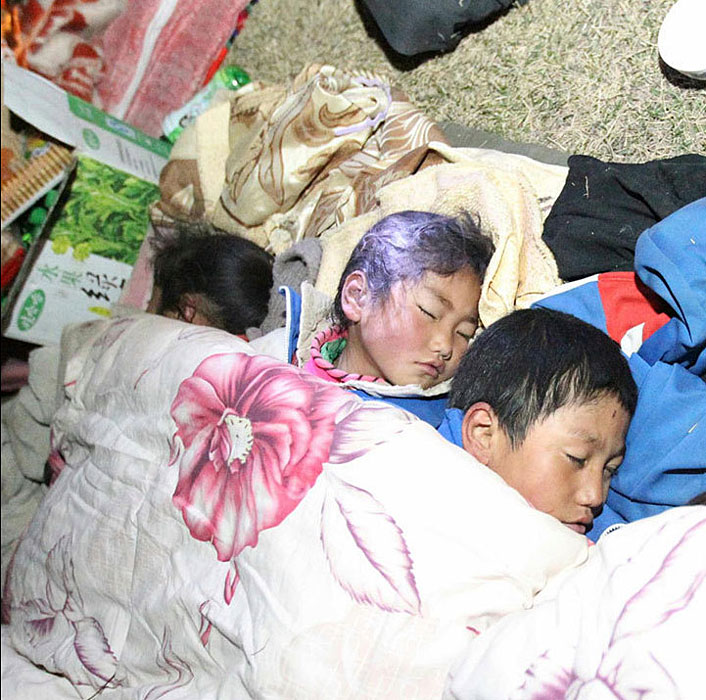 圖為4月14日深夜,幾名受災(zāi)兒童在露天睡覺,他們的父母正在旁邊搭建帳篷。圖片來源:新華網(wǎng) 丁林攝