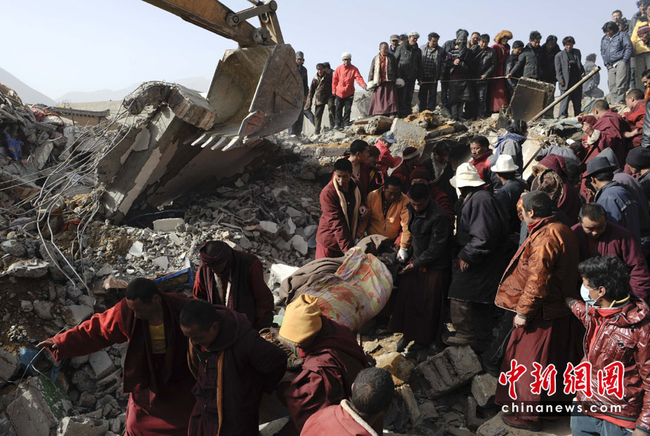 4月15日,青海玉樹縣勝利路口,玉樹當(dāng)?shù)厣畟H和民眾正在積極救援被困廢墟的民眾。中新社發(fā) 廖攀 攝