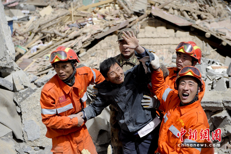 4月15日12時(shí),中國(guó)國(guó)際地震救援隊(duì)在青海玉樹(shù)縣結(jié)古鎮(zhèn)西北牛賓館廢墟上救出了四名幸存者,其間經(jīng)歷了三次余震。中新社發(fā) 廖攀 攝