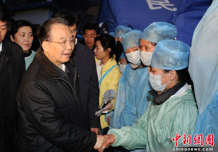 4月15日20時,中國國務(wù)院總理溫家寶來到青海省玉樹縣玉樹自治州醫(yī)院看望受災(zāi)民眾和醫(yī)務(wù)人員。中新社發(fā) 廖攀 攝
