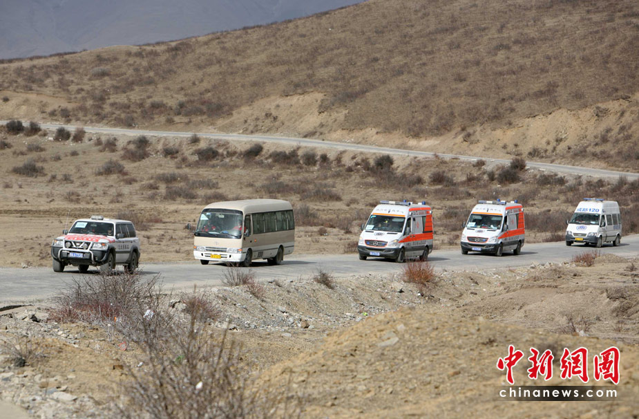 4月16日,四川省衛(wèi)生廳從成都派出首支國家醫(yī)療救援隊(duì)經(jīng)過1200余公里,40小時的長途跋涉,醫(yī)療救援車隊(duì)平安抵達(dá)青海省玉樹地震重災(zāi)區(qū)。圖為醫(yī)療車隊(duì)正在翻越海拔5000多米的海子山。中新社發(fā) 劉忠俊 攝