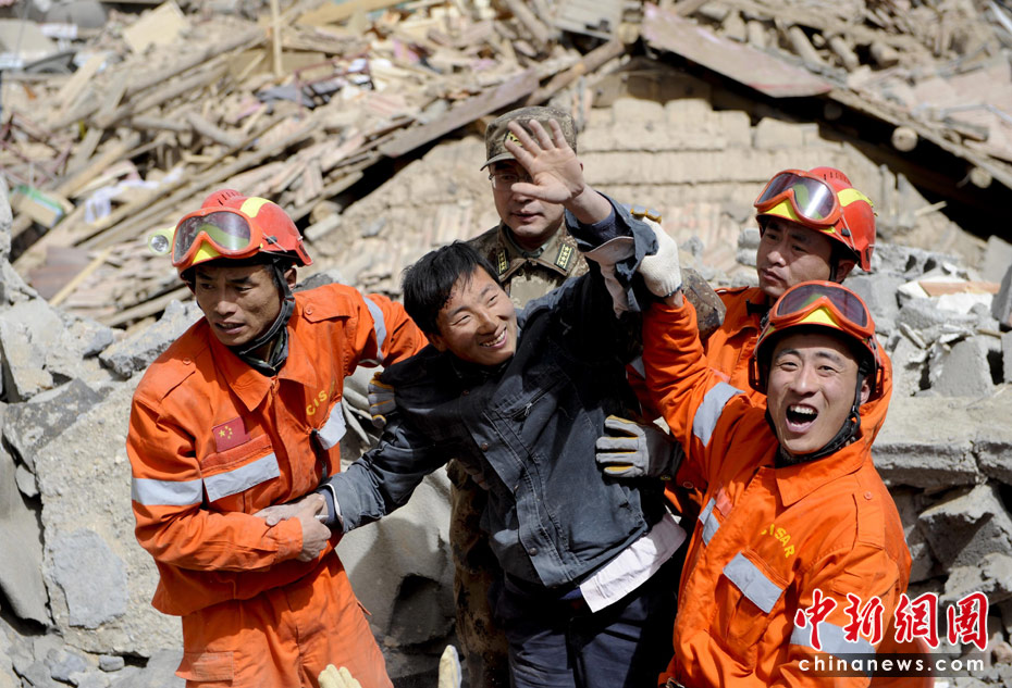 圖為4月15日12時(shí),一位幸存者被中國(guó)國(guó)際地震救援隊(duì)在青海玉樹縣結(jié)古鎮(zhèn)西北牛賓館廢墟中救出,他微笑著揮動(dòng)手臂。中新社發(fā) 廖攀 攝