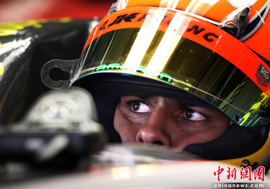 4月16日,2010國際汽聯(lián)F1世界錦標賽上海站在上海國際賽車場開始車手第一、第二次練習(xí)賽。圖為代表印度車隊出戰(zhàn)的印度車手查鐸。中新社記者 任晨鳴 攝