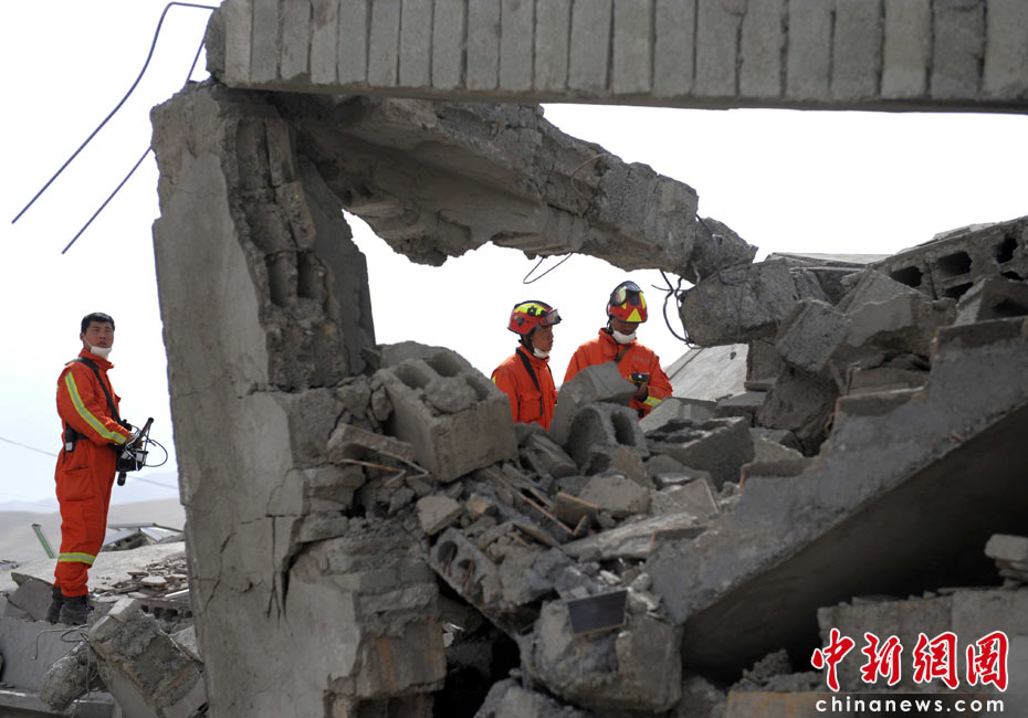 4月16日,青海玉樹地震救援進(jìn)入第三天,來自蘭州軍區(qū)、山東消防特勤、重慶特勤、廣東邊防總隊(duì)、云南邊防總隊(duì)、青海民兵等搜救醫(yī)療救護(hù)隊(duì)連續(xù)作戰(zhàn)。中新社發(fā) 陳文 攝
