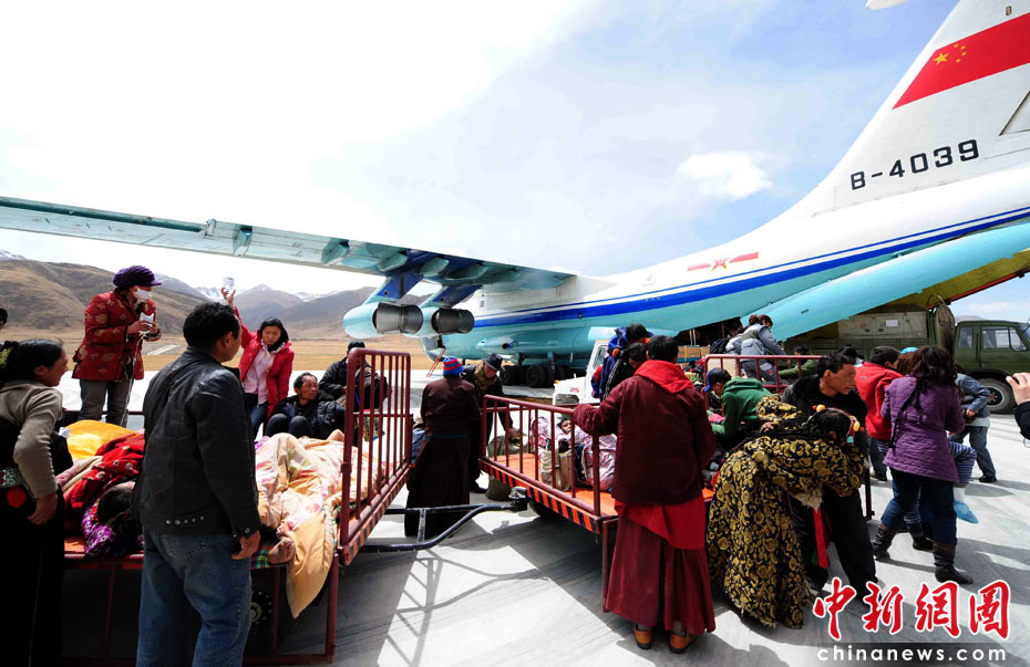 4月16日15時,青海玉樹機(jī)場,149名藏族重傷員準(zhǔn)備乘坐廣空運(yùn)輸航空兵某師兩架伊爾-76型運(yùn)輸機(jī)飛往格爾木機(jī)場。中新社發(fā) 沈玲 攝