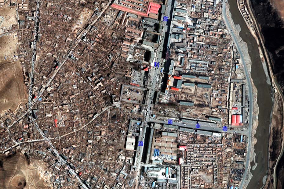 利用對地觀測中心2010年4月16日獲取的高分辨率航空遙感數(shù)據(jù),提取出玉樹州結(jié)古鎮(zhèn)城區(qū)范圍內(nèi)地震破壞最嚴(yán)重或典型地區(qū),使之與GoogleEarth中相應(yīng)位置的震前遙感衛(wèi)星數(shù)據(jù)進(jìn)行對比,直觀展現(xiàn)結(jié)古鎮(zhèn)在此次地震中的受影響程度。圖片來源:中國科學(xué)院