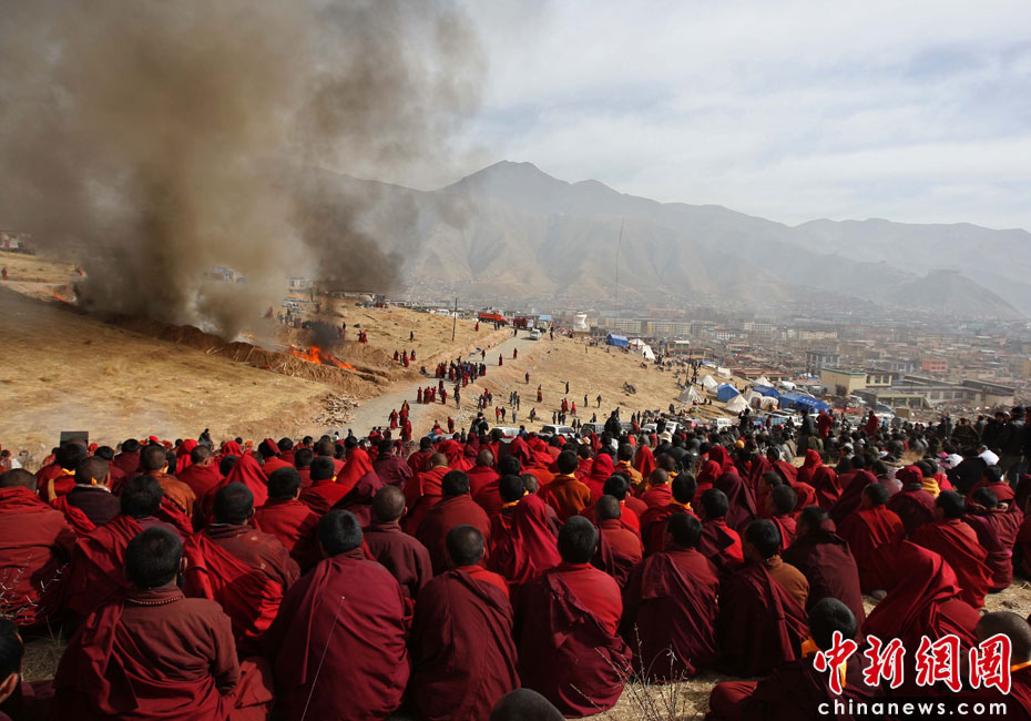 4月17日,青海省玉樹(shù)縣結(jié)古鎮(zhèn)附近的山坡上,眾多地震遇難者遺體被火葬。當(dāng)日,為妥善及時(shí)處理遇難人員遺體,預(yù)防災(zāi)區(qū)疫情的發(fā)生與流行,青海出臺(tái)地震遇難人員遺體處理意見(jiàn),強(qiáng)調(diào)在處理遺體時(shí)要尊重少數(shù)民族喪葬習(xí)俗,尊重死者尊嚴(yán)。圖為眾多僧侶為逝者祈禱。中新社發(fā) 盛佳鵬 攝