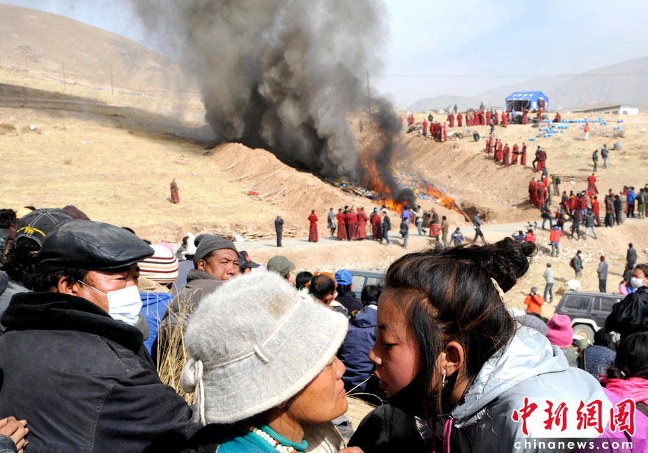 4月17日,青海省玉樹縣結(jié)古鎮(zhèn)附近的山坡上,眾多地震遇難者遺體被火葬。當(dāng)日,為妥善及時處理遇難人員遺體,預(yù)防災(zāi)區(qū)疫情的發(fā)生與流行,青海出臺地震遇難人員遺體處理意見,強(qiáng)調(diào)在處理遺體時要尊重少數(shù)民族喪葬習(xí)俗,尊重死者尊嚴(yán)。中新社發(fā) 廖攀 攝