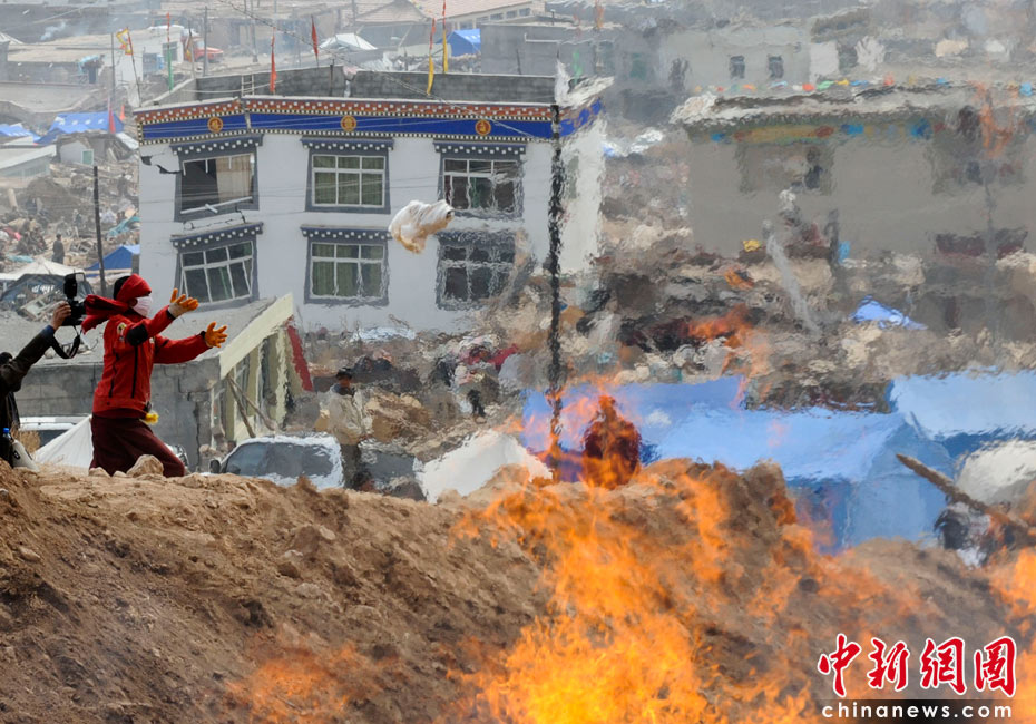 4月17日,青海省玉樹縣結古鎮(zhèn)附近的山坡上,眾多地震遇難者遺體被火葬。當日,為妥善及時處理遇難人員遺體,預防災區(qū)疫情的發(fā)生與流行,青海出臺地震遇難人員遺體處理意見,強調在處理遺體時要尊重少數民族喪葬習俗,尊重死者尊嚴。圖為眾多僧侶為逝者祈禱。中新社發(fā) 廖攀 攝