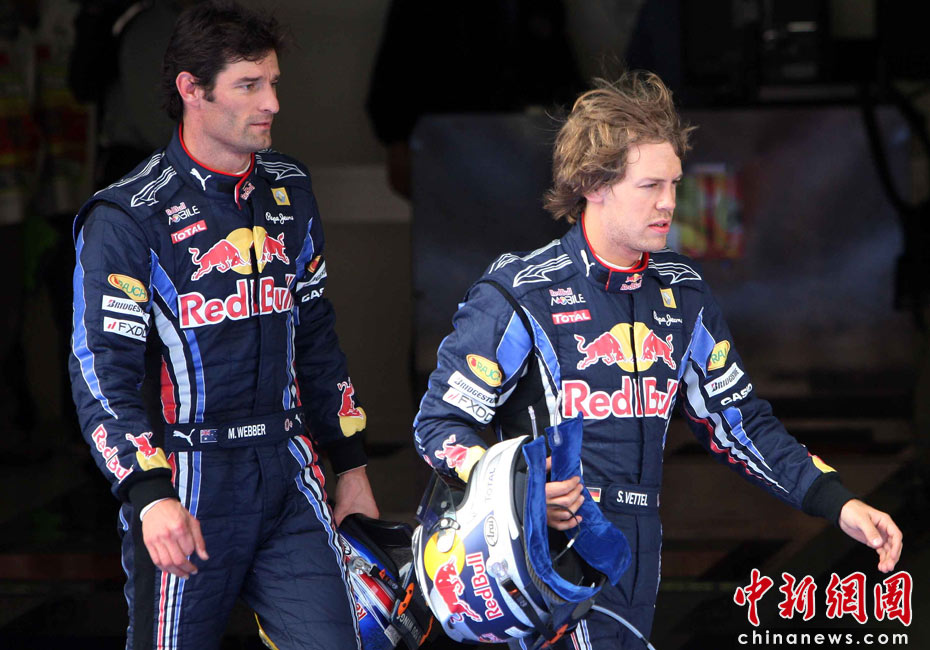 4月17日下午,2010國(guó)際汽聯(lián)F1世界錦標(biāo)賽上海站在上海國(guó)際賽車場(chǎng)舉行排位賽,代表紅牛車隊(duì)出戰(zhàn)的德國(guó)車手維特爾(右)獲得桿位,隊(duì)友、澳大利亞車手韋伯獲得第二名,法拉利車隊(duì)的西班牙車手阿隆索獲得第三名。中新社記者 任晨鳴 攝