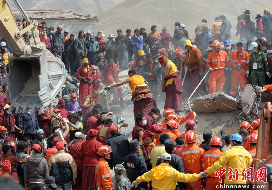 4月17日,中國(guó)地震救援隊(duì)、四川救援隊(duì)在玉樹(shù)結(jié)古鎮(zhèn)三岔路城建一號(hào)商鋪展開(kāi)搜救,救援隊(duì)員、僧人、志愿者等在同一搜救點(diǎn)連續(xù)奮戰(zhàn)。中新社發(fā) 陳文 攝