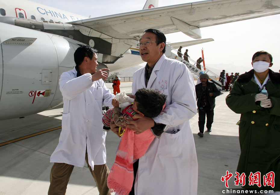 4月18日,青海省第五人民醫(yī)院院長吳天俊等在玉樹機(jī)場(chǎng)搶運(yùn)受傷嬰兒。中新社發(fā) 蘇丹 攝