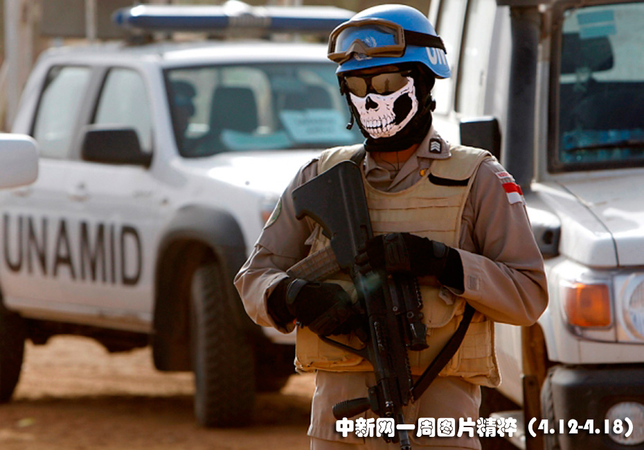 4月13日周二,在蘇丹法希爾郊區(qū)的一處難民營,一名聯(lián)合國駐蘇丹達爾富爾維和人員正在站崗。官方表示,四名維和人員不久前在這一地區(qū)失蹤。