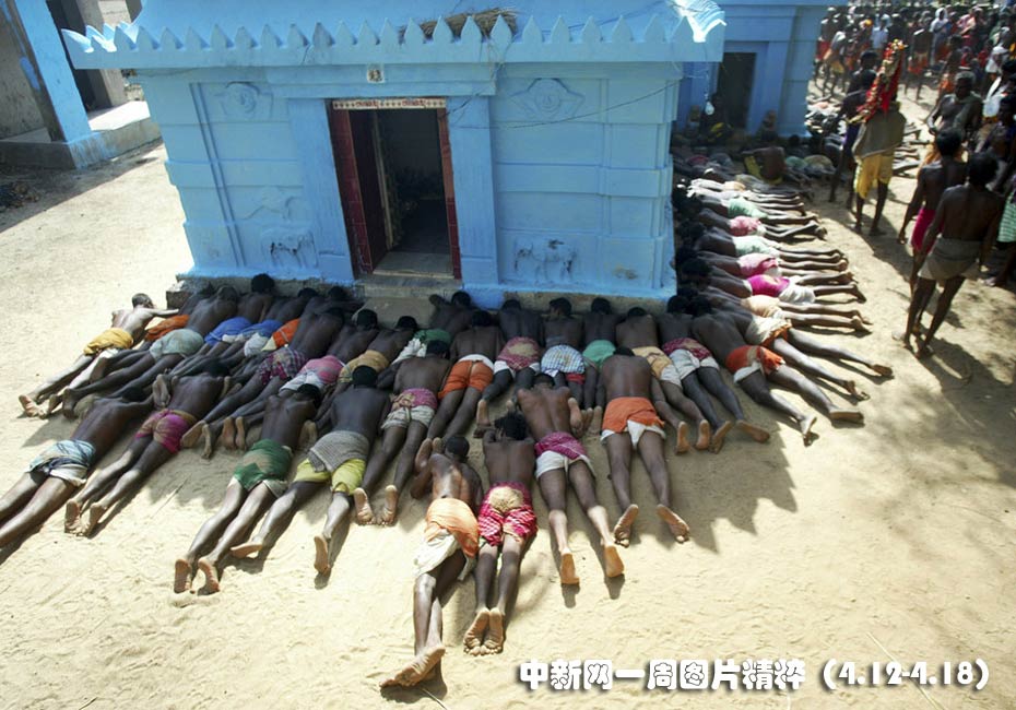 4月14日周三,印度村民拜倒在一個(gè)印度教寺廟前。